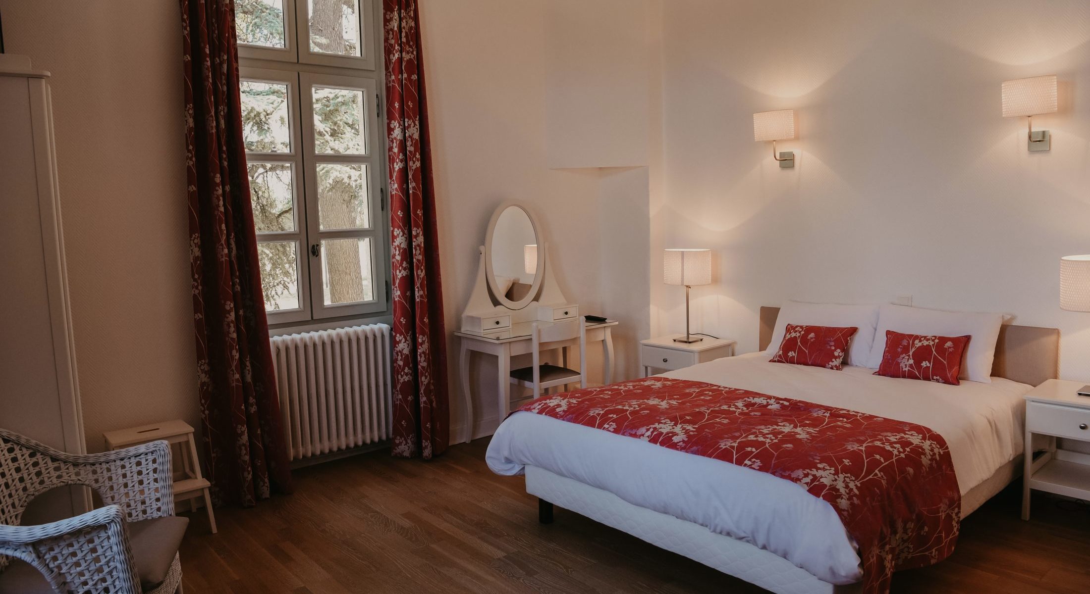 Avec son parquet, ses meubles blancs et sa décoration florale, la Chambre Nuptiale est une invitation à la tendresse, idéale pour les jeunes mariés ou les couples qui fêtent un anniversaire de mariage.
